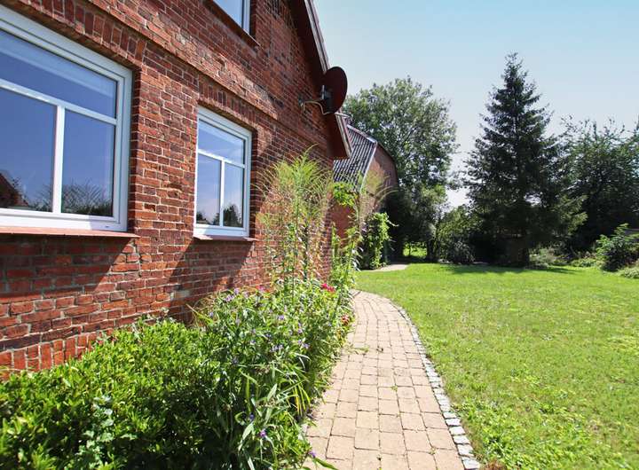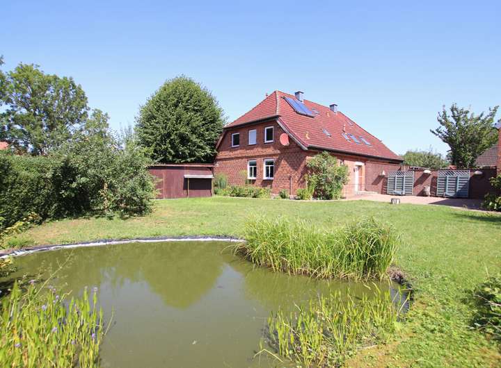 Das ca. 863 m² große Grundstück ist teilweise umzäunt und verfügt über eine großzügige, süd-ost ausgerichtete Terrasse mit etwa 40 m², die perfekt für gemütliche Sommerabende geeignet ist. Ein großer Teich ergänzt die Außenanlage und schafft eine entspannte Atmosphäre. Das Haus ist massiv gebaut, mit einer ansprechenden Klinkerfassade und einem Krüppelwalmdach, das im Jahr 1998 erneuert und im Jahr 2008 nachträglich noch gedämmt wurde.
