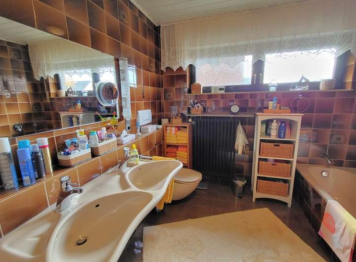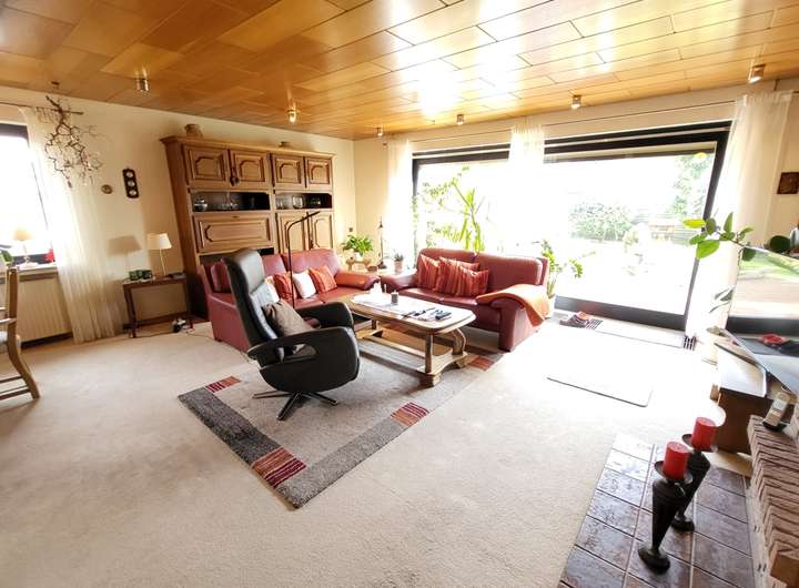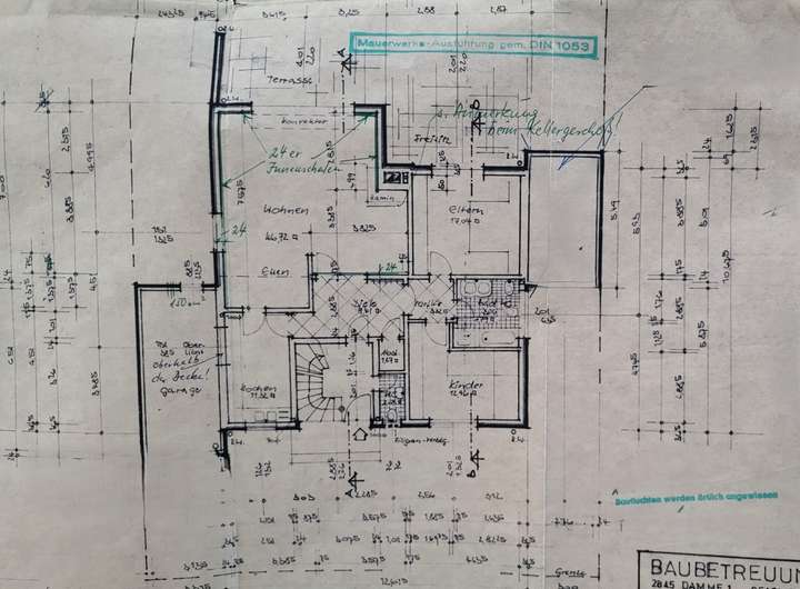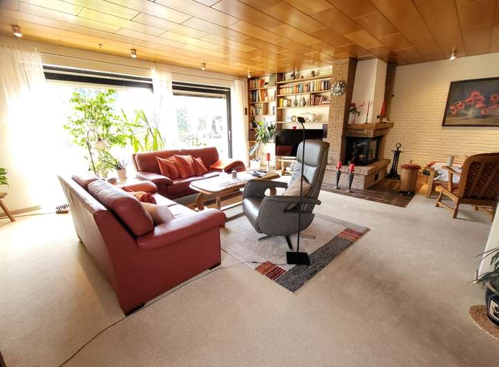 Heizanlage Vaillant ca. 2020 neu, Holzinnentüren mit Holzzargen, Holzrahmenfenster mit Doppelverglasung, Kunststeinfensterbänke, Aussenrolläden (manuell), Stahlbetondecken, Spitzboden (Holzeinschubtreppe), Verblendsteinmauerwerk, Loggia mit Fliesenboden, überwiegend Teppichboden / Fliesen / vereinzelt Parkettboden, große Terrasse (Grundfläche ca. 40m²) mit Überdachung (Holz-Glaskonstruktion), Innen-/Außenkamin, zwei PKW-Garagen (jeweils mit ca. 16m² Nutzfläche, eine Garage mit zusätzlichem Werk-/Abstellraum ca. 7,50m², Metalltore)