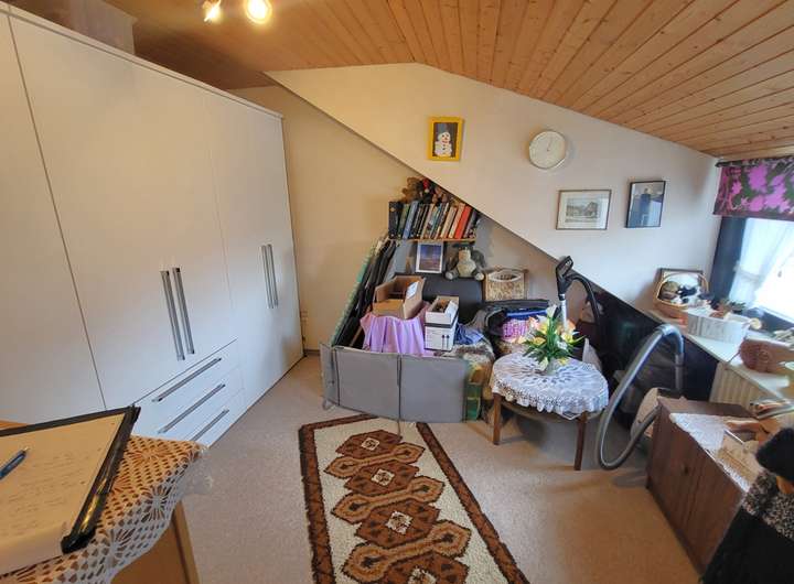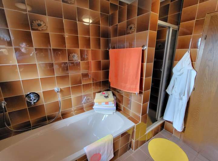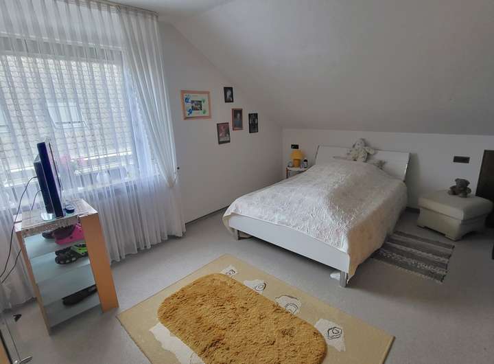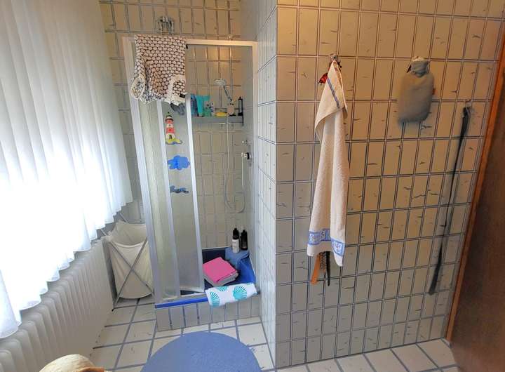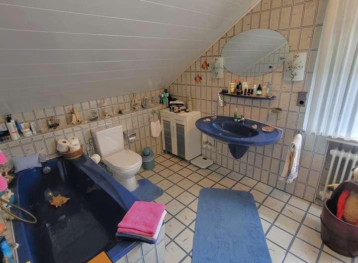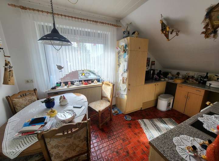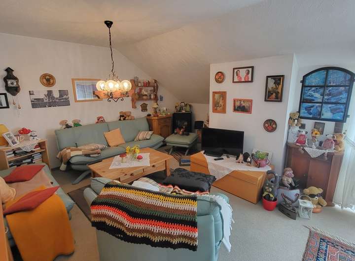 Das Dachgeschoss bietet eine weitere vollwertige Wohneinheit mit Wohnzimmer, Schlafzimmer, Küche, einem gefliesten Flurbereich sowie einem Tageslichtbad mit Dusche und Badewanne (beige/blaue Fliesen bis zur Decke). Besonders einladend ist die sonnige Loggia mit Fliesenboden, die einen herrlichen Blick ins Grüne bietet.