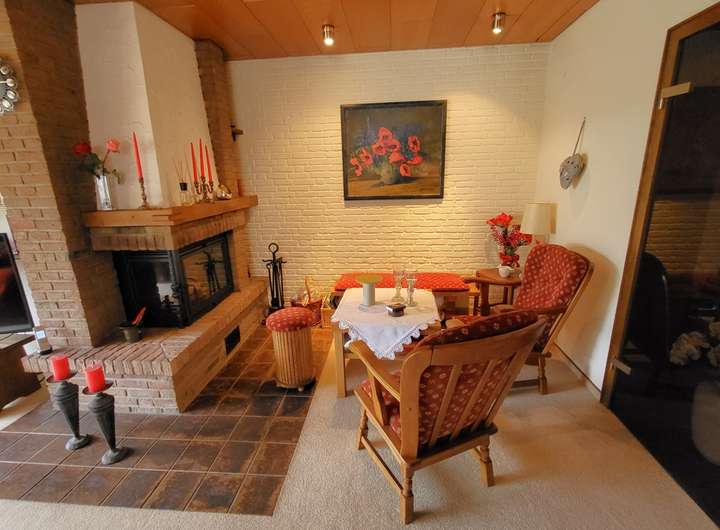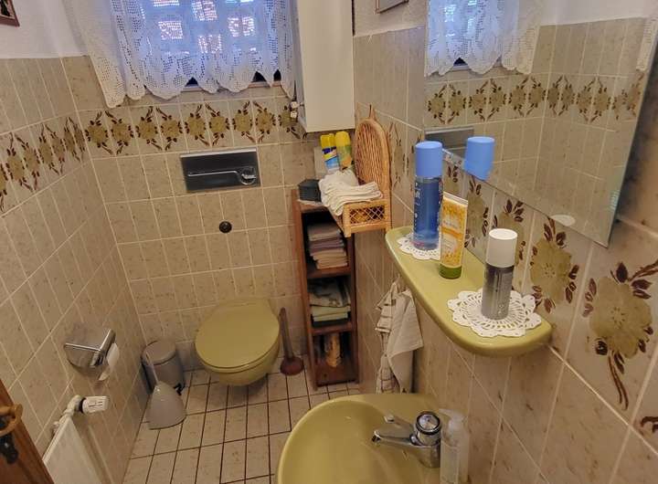 Im Erdgeschoss befinden sich ein Flurbereich, ein Schlafzimmer, ein Wohnzimmer mit gemütlicher Kaminecke, ein Kinderzimmer, eine Küche (beige Bodenfliesen und Fliesenspiegel), ein Tageslichtbad mit Badewanne und Dusche (braune Boden- und Wandfliesen bis zur Decke) sowie ein separates Gäste-WC mit Tageslicht (grüne Wand- und Bodenfliesen, Hänge-WC).