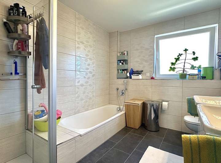 - geschmackvolles Tageslichtbad mit ebenerdiger Dusche, Badewanne, WC und Doppelwaschbecken