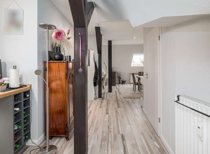 Der großzügige Grundriss, hohe Decken und sichtbare Balkenelemente schaffen eine einladende Wohnatmosphäre.
