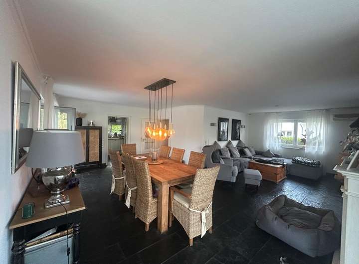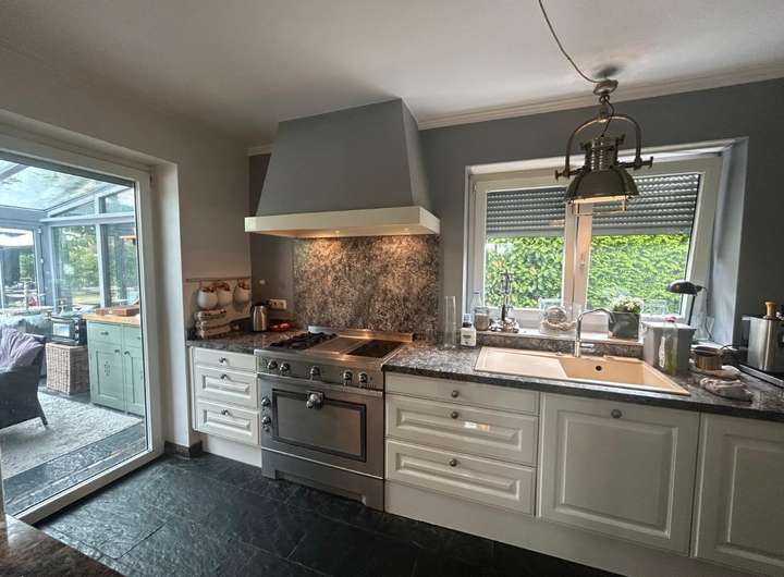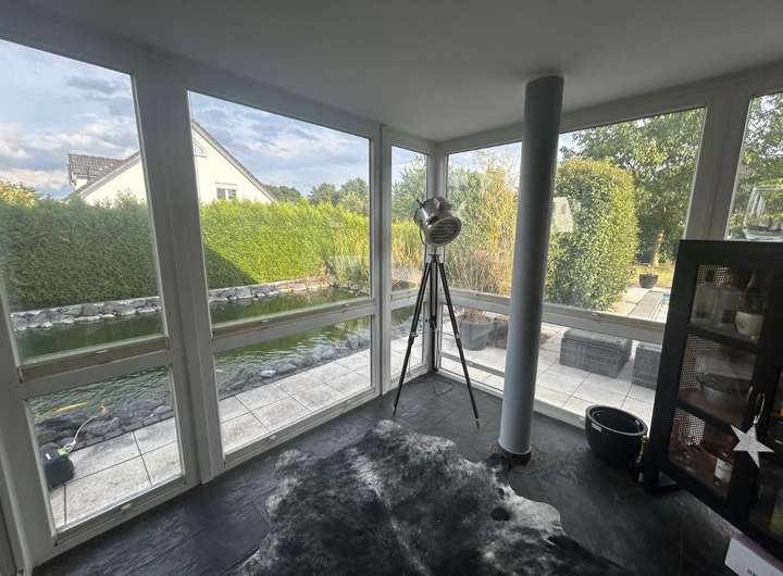 Im Erdgeschoss erwartet Sie ein großzügiger Wohn- und Essbereich mit herrlichem Blick auf den großen Teich.Die hochwertige Küche mit angrenzendem Wintergarten mit Fußbodenheizung und praktischer Hauswirtschaftsraum lassen keine Wünsche offen. Vom Wohnzimmer aus gelangen Sie direkt auf die weitläufige Terrasse - perfekt, um den Feierabend zu genießen.