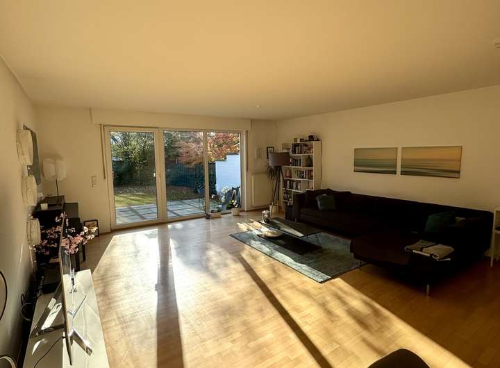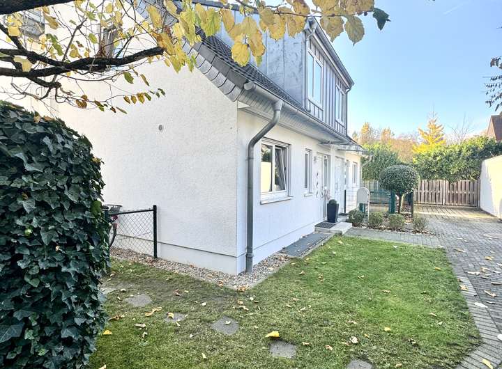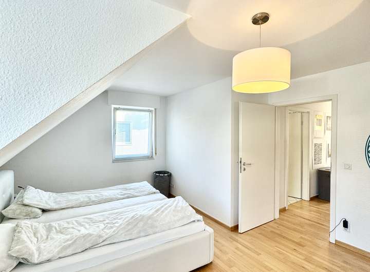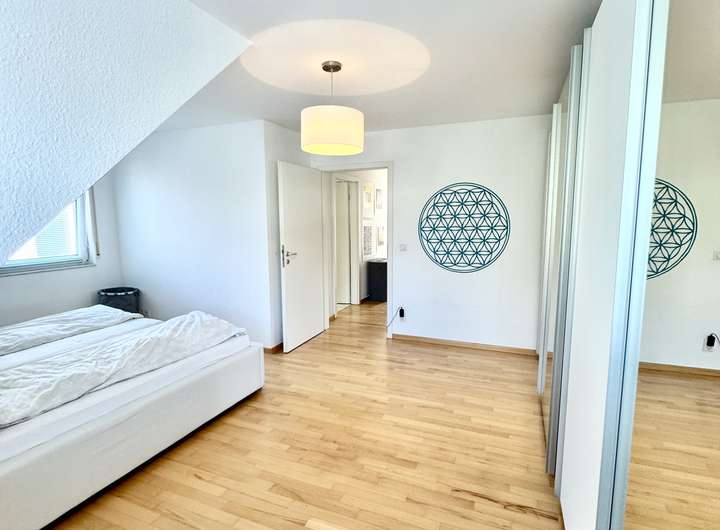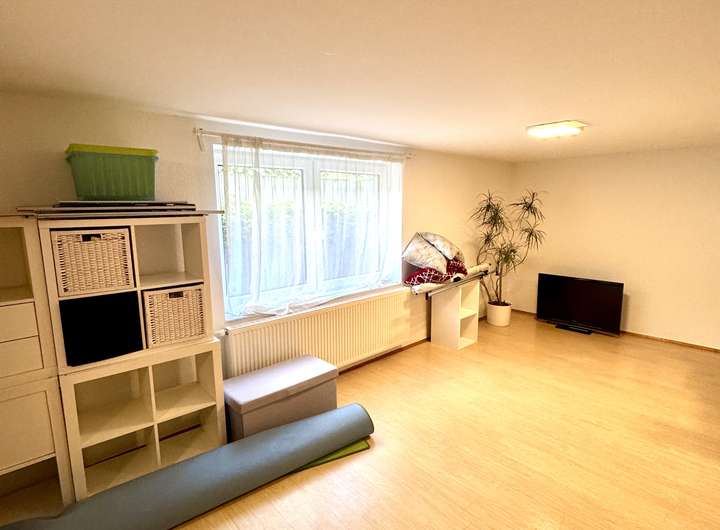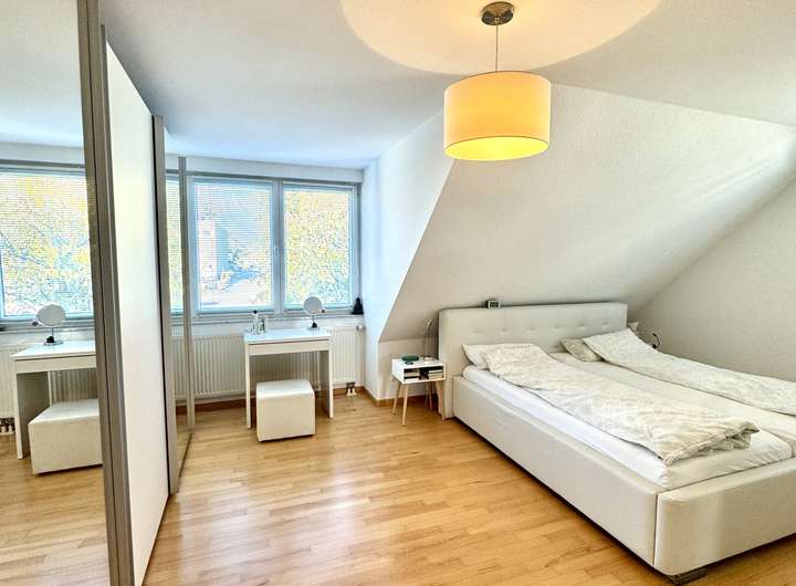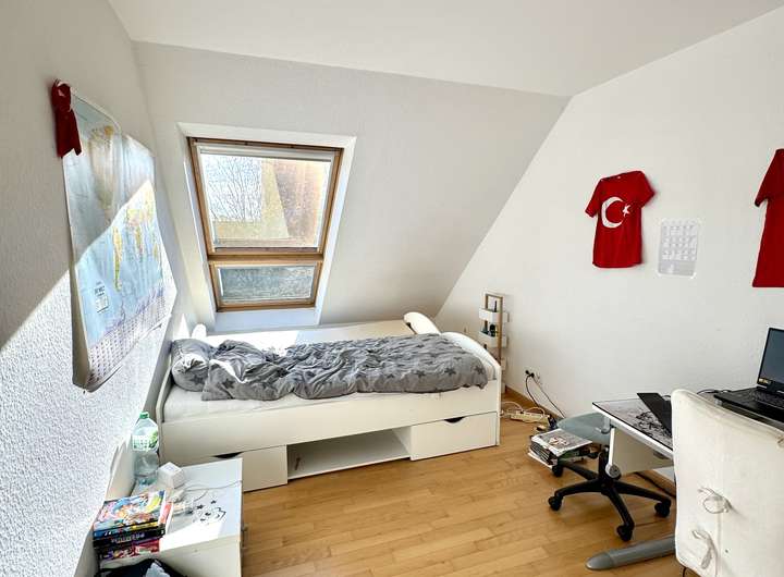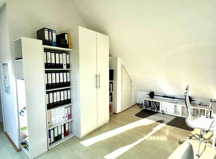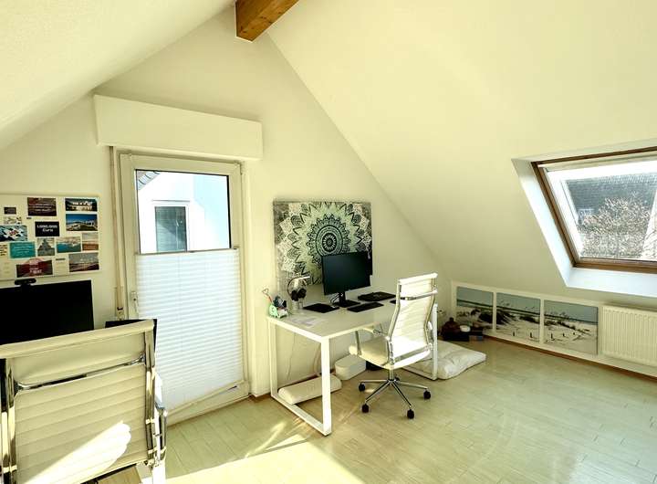 Die Fenster seitlich zum Garten hin sind sehr weiträumig ausgeschachtet, so dass die Fenster reichlich Sonnenlicht in den Raum lassen. Das Zimmer läßt sich optimal als Jugendzimmer oder als Au-pair Bereich nutzen.