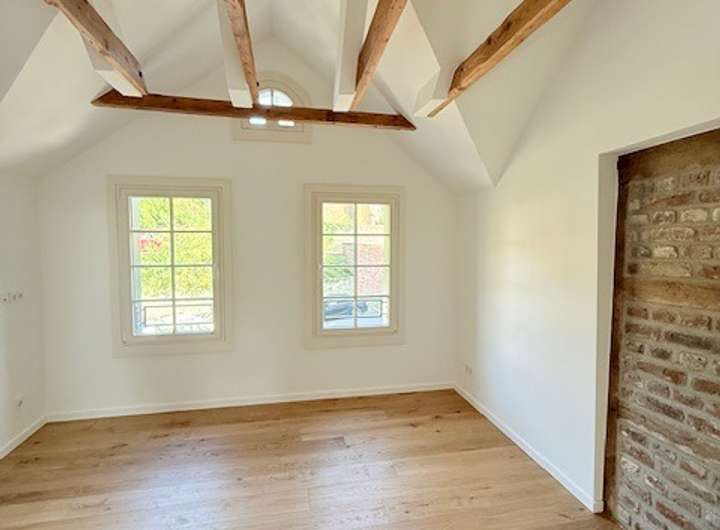 - Sichtbares offenes Gebälk und altes teilweise freigelegtes Backsteingemäuer