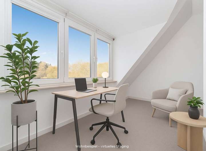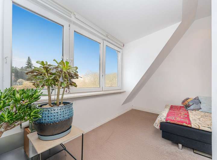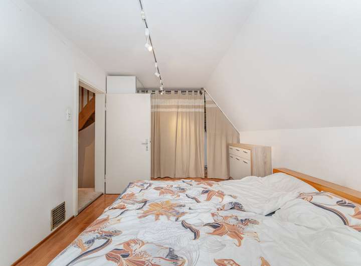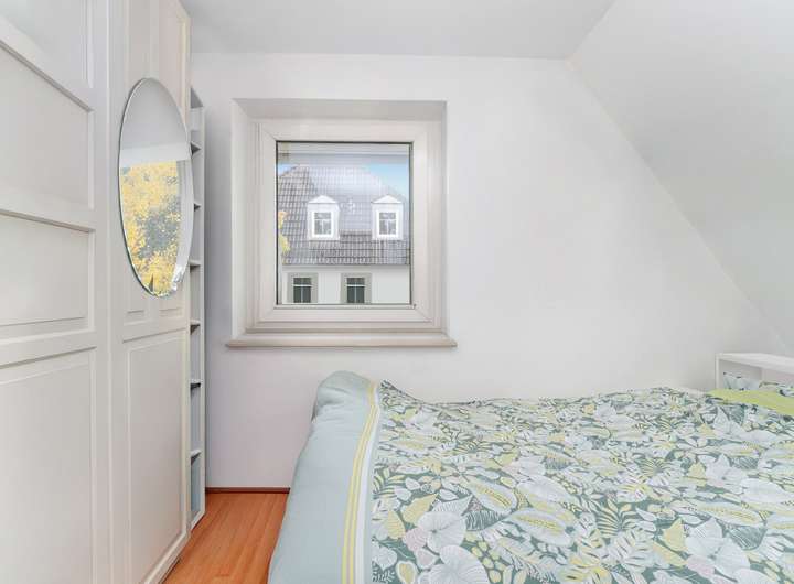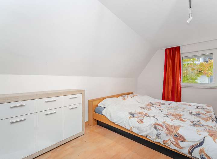 Im Dachgeschoss befinden sich zwei Schlafräume mit Fenster, sowie ein helles Bad mit Badewanne und großen Gaubenfenstern, die viel Tageslicht hereinlassen. Der ausgebaute Dachspitz bietet zusätzlichen Raum, ideal als Arbeits-, Gäste- oder Hobbyzimmer.