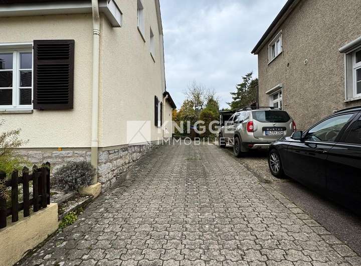 Zu dieser Immobilie gehören zwei hintereinander liegende Außenstellplätze und ein weitläufiger, gepflegter Garten mit Gartenhäuschen.