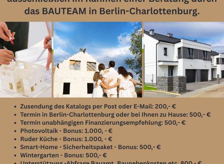 Als Dankeschön erhalten Sie einen Bonus von bis zu 10.000 Euro* für eine Beratung in Berlin Charlottenburg durch unser BAUTEAM, wenn Sie einen Bauvertrag mit uns abschließen. Beratung auch auf Englisch möglich.