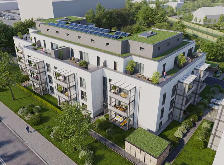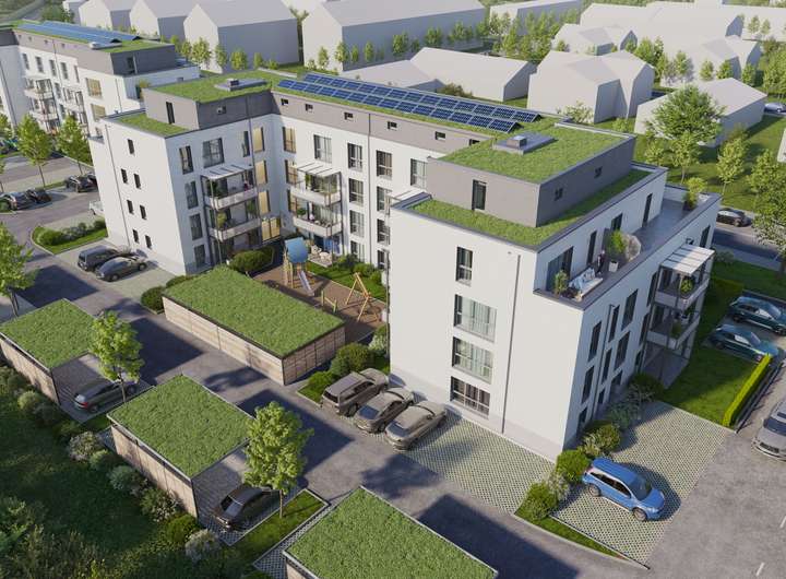 Vom 1.OG bis 3.OG werden Balkone gebaut.Das Staffelgeschoss erhält jeweils eine Dachterrasse mit begrünter Flachdachabdichtung.