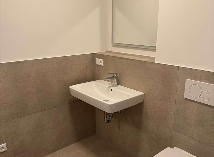 Bäder und WC erhalten Fliesen aus Feinsteinzeug in farblicher Abstimmung mit den Wandfliesen. Hauswirtschafts- bzw. Abstellräume in den Wohnungen erhalten den gleichen Fliesenbelag.