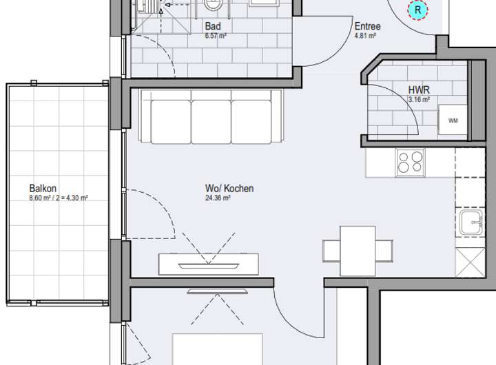 Waschmaschinenanschluss: Ein Waschmaschinenunterputztraps ist geplant in den HW-Räumen.