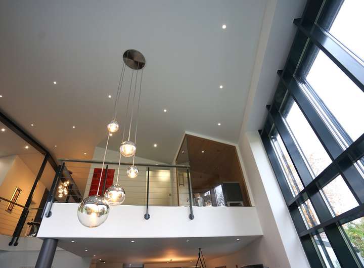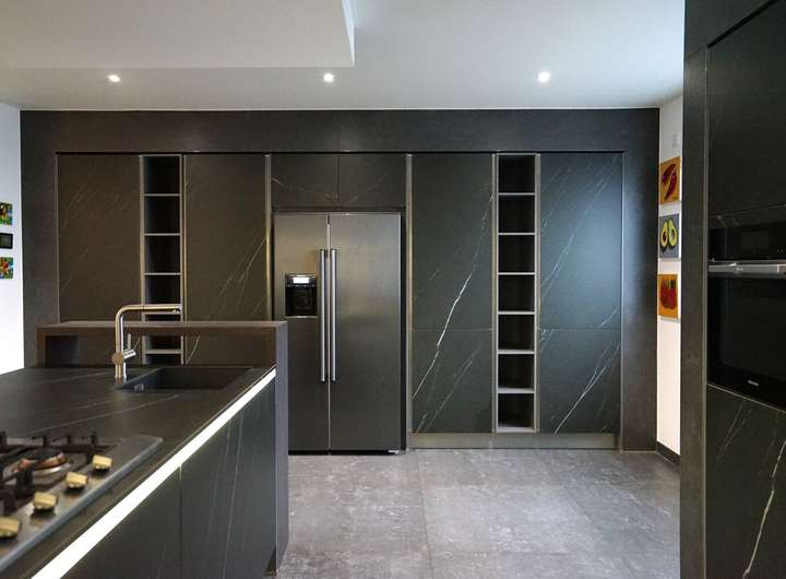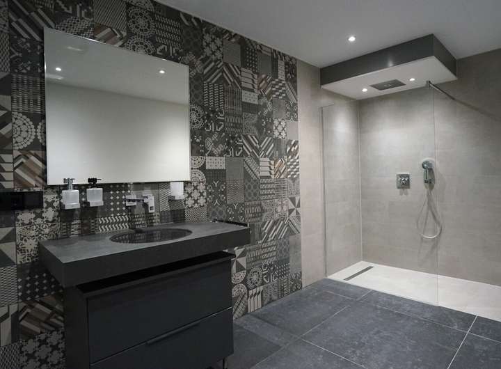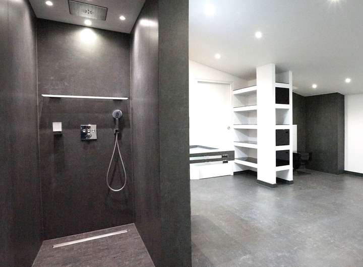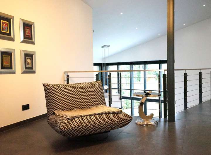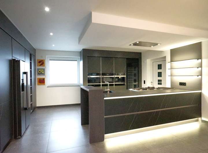 Großformatige, italienische Designerfliesen, eine offene Deckengestaltung mit mehreren Galerien und viele funktionale Details prägen das besondere Ambiente des Hauses. Die beeindruckende, offene Küche der Firma Joppe schließt sich dem Wohnbereich an und ist mit hochwertigen Einbaugeräten, großzügigen Arbeitsflächen und viel Stauraum ausgestattet – ein zentraler Treffpunkt für die ganze Familie. Ein direkter Zugang zur Garage macht zudem das Ausladen des Einkaufs zum Kinderspiel. Zwei Gäste- oder Kinderzimmer sowie ein Badezimmer mit Dusche befinden sich ebenfalls auf dieser Ebene, was den Wohnkomfort zusätzlich erhöht.
