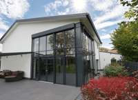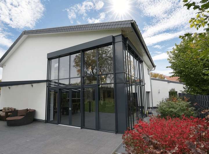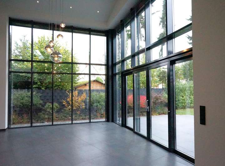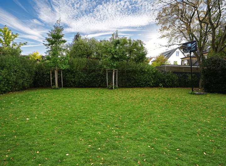 Das Haus befindet sich auf einem ca. 983 m² großen Grundstück. Der Garten wurde nach einem professionellen Pflanzkonzept angelegt und bietet mit einer Vielfalt an unterschiedlichen Pflanzen ein dynamisches grün-rotes Farbspiel das ganze Jahr hindurch. Dieses private Refugium, das sich vor der raumhohen Glasfront erstreckt, schafft eine wohltuende, naturnahe Atmosphäre und verbindet das Innere des Hauses harmonisch mit der Außenwelt. Für absolute Privatsphäre und Lichtregulierung sorgen die elektrischen Raffstores.