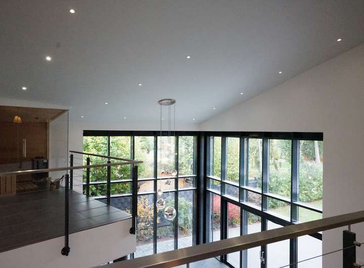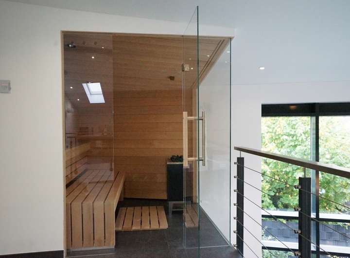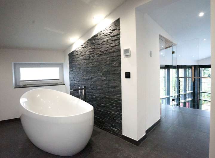 Die obere Etage ist über die imposante Designtreppe mit hochwertiger Schieferwandverkleidung zu erreichen und wurde als privater Rückzugsort konzipiert. Hier befinden sich das Master-Schlafzimmer mit dem direkt angrenzenden, luxuriösen En-Suite -Bad mit frei stehender Badewanne und ebenerdiger Dusche. Ein besonderes Highlight ist die gläserne Sauna mit Blick ins Grüne – Ihr persönlicher Wellnessbereich. Ein großzügiges, komplett ausgestattetes Ankleidezimmer und eine offene Galerie, die als stilvolles Homeoffice mit Rundumblick dient, runden diese Etage ab.