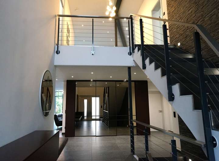 Im Erdgeschoss eröffnet sich der repräsentative Eingangsbereich, der durch seine Weitläufigkeit und Helligkeit ein sofortiges Gefühl von Großzügigkeit vermittelt. Von hier aus gelangen Sie in den großzügigen und offen gestalteten Wohn- und Essbereich, der durch raumhohe Fensterfronten über zwei Etagen lichtdurchflutet ist.