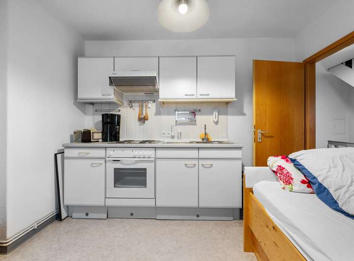 Im Dachgeschoss erwartet Sie ein weiteres Zimmer mit direktem Zugang zur sonnigen Dachterrasse, die einen herrlichen Rückzugsort im Freien bietet. Ebenfalls auf dieser Ebene befinden sich eine Küche und ein Badezimmer, sodass hier eine eigenständige Wohneinheit möglich ist.