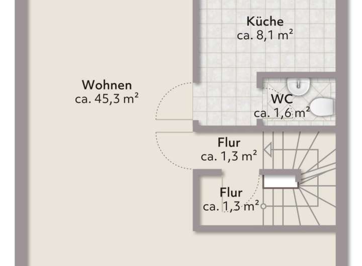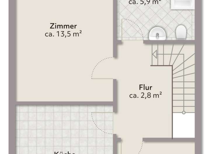 Das Obergeschoss beeindruckt mit einem großzügigen Wohnraum, der zum Entspannen oder geselligen Beisammensein einlädt. Hier befindet sich außerdem eine Küche sowie ein separates Gäste-WC, das den Wohnkomfort abrundet.