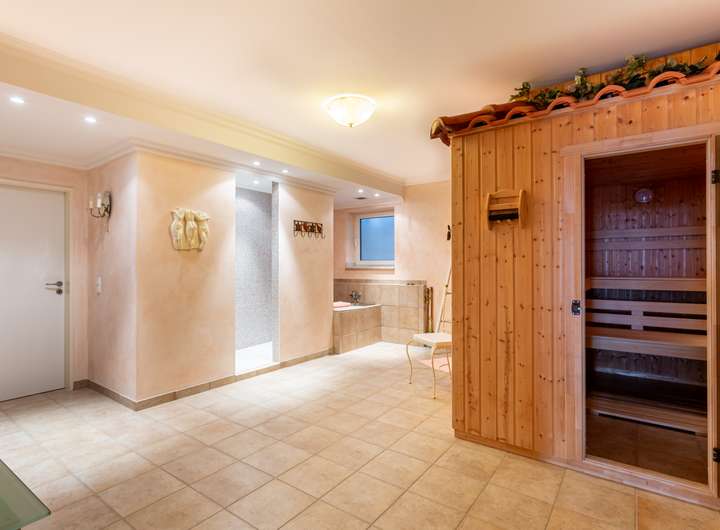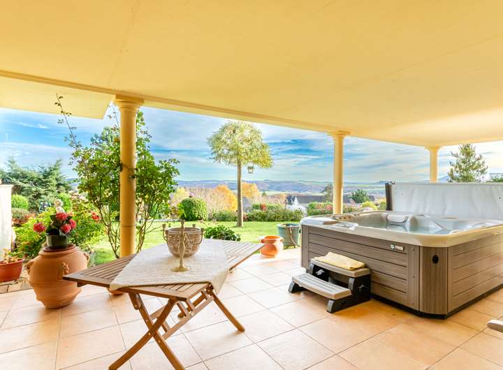 Im Untergeschoss befinden sich weitere großzügige Nutzflächen, ein wunderbarer Wellnessbereich mit Sauna, Dusche und WC sowie ein zusätzliches Schlafzimmer und ein großes Büro. Hier sind auch Küchenanschlüsse, so dass hier problemlos eine eigenständige Wohneinheit etabliert werden kann. Dieser Bereich hat eine eigene, großzügige und überdachte Terrasse. Hier können Sie absolut blickgeschützt Ihren Whirlpool genießen.