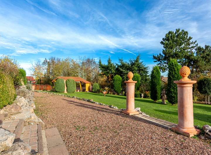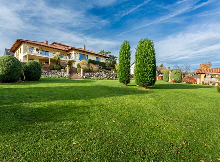 Das südöstlich ausgerichtete Grundstück ist parkähnlich angelegt und mit mediterranen Sträuchern und Zierpflanzen bepflanzt. Zwei große Sonnenterrassen laden zum Entspannen ein, das offene Gartenhaus mit Beleuchtung und Terrakottasitzgruppe schafft Urlaubsflair. Eine Drainage, die 10.000-Liter-Regenwasserzisterne und die neu gepflasterte Einfahrt mit Antikpflaster „Terra Toskana“ komplettieren das Gesamtbild.