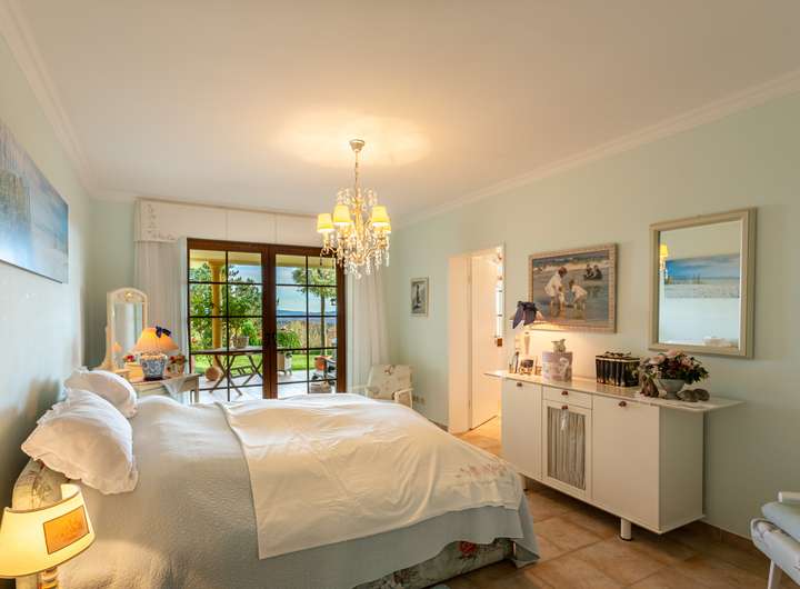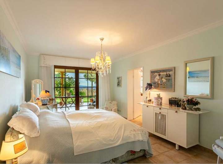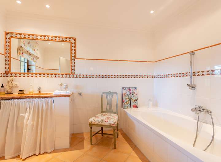 Die offene Wohnküche mit neuwertigen Elektrogeräten fügt sich harmonisch in den Wohnbereich ein und wird durch eine zweite Sommerküche als Back-Up ergänzt. Der separate Schlaftrakt mit Schallschutzmauer bietet zwei Schlafzimmer, jeweils mit Ankleidezimmer, sowie ein luxuriöses Masterbad. Das Gäste-WC im Eingangsbereich setzt mit französischen Fliesen einen individuellen Akzent und betont den mediterranen Stil des Hauses.