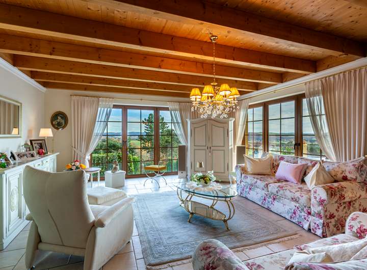 Bereits der großzügige Eingangsbereich mit zwei Säulen vermittelt Eleganz und Weite. Von hier gelangt man in den offen gestalteten Wohn- und Essbereich mit Marmorkamin im mediterranen Stil, hohen Decken, teilweise mit Schweizer Dielen und Zugang zur Terrasse. Große Fenster mit Wärmeschutzverglasung, Mehrfachverriegelung und innenliegenden Sprossen lassen viel Licht herein und bieten einen herrlichen Blick ins Grüne. Im gesamten Haus sind elektrisch gesteuerte, gedämmte Aluminium-Rollläden verbaut.