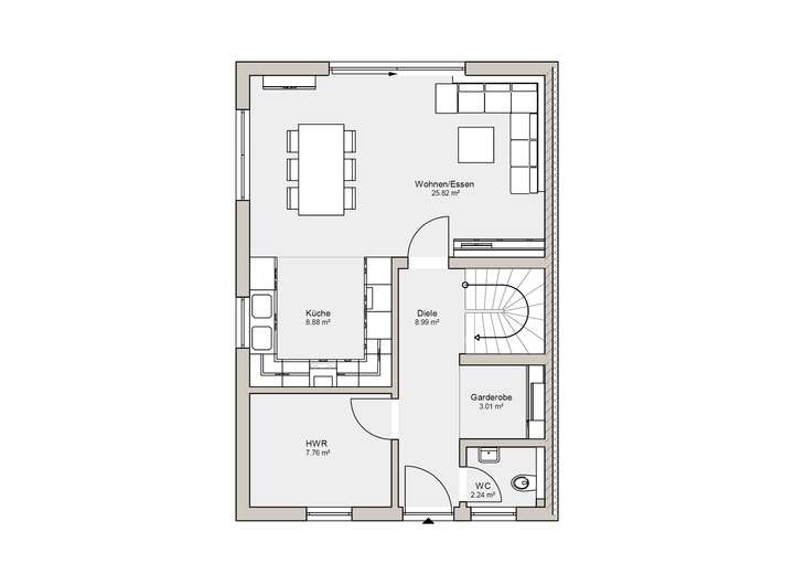 Dabei muss man im Grundriss auf nichts verzichten! Das Erdgeschoss betritt man über einen einladenden Flur mit praktischer Garderobennische. Hauswirtschaftsraum und Gäste-WC sind von dort auf kurzem Wege zu erreichen. Wohn- und Essbereich sowie Küche bieten einen Blick in den eigenen Garten, große Fensterelemente spenden Licht und lassen den Raum noch großzügiger wirken.