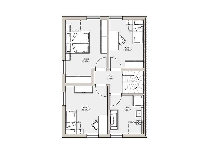 Das Dachgeschoss bietet mit zwei Kinderzimmern Platz für die ganze Familie. Auch hier versorgen die großen Gauben den Wohnraum mit viel Licht und lassen die Wohnräume stets hell und freundlich erscheinen. Das Badezimmer bietet genügend Raum für ein entspannendes Dusch- und Badeerlebnis. Das Dachgeschoss kann auf Wunsch um ein praktisches Home-Office erweitert werden.