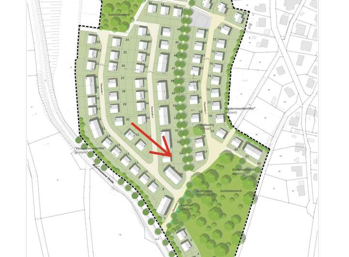 Das hier zum Verkauf angebotene Grundstück mit der Parzellennummer 54 umfasst 596 m² und liegt im westlichen Bereich des Neubaugebietes.