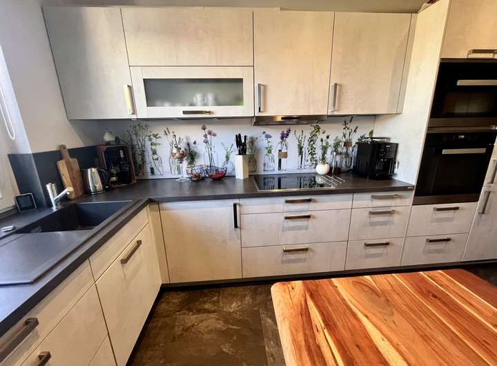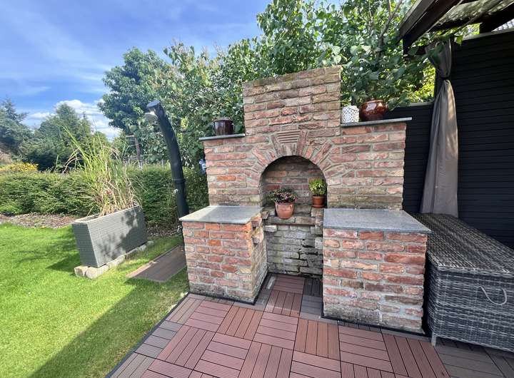 Im Erdgeschoss erwartet Sie ein großzügiges Wohnzimmer mit Kamin, eine hochwertige Einbauküche (2019, Miele-Geräte) sowie Zugang zum überdachten Freisitz mit angrenzendem Grillplatz. Der Garten ist liebevoll angelegt, pflegeleicht und bietet viel Platz zum Entspannen.