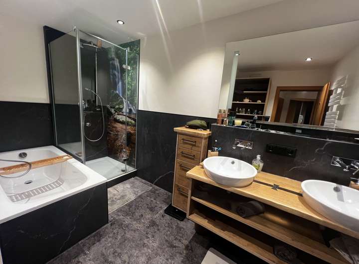 Willkommen in Ihrem neuen Zuhause im Herzen von Oberstdorf – einer Adresse, die Ruhe, Komfort und alpines Lebensgefühl perfekt vereint. Diese modern ausgestattete 4-Zimmer-Erdgeschosswohnung aus dem Baujahr 2000 erstreckt sich über ca. 96 m² und begeistert mit einem gut geschnittenen Grundriss. Bereits beim Eintreten empfängt Sie eine zentrale Diele mit praktischer Garderobe, von der aus Sie sowohl das separate WC als auch das großzügige im modernen Stil gestaltete Hauptbad mit Doppelwaschtisch, Dusche und Badewanne erreichen – ideal für entspannende Wohlfühlmomente nach einem aktiven Tag in den Bergen.