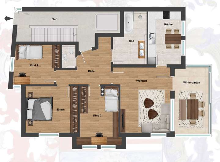 Drei gemütliche Schlafzimmer (oder natürlich auch Büros) schaffen Rückzugsorte voller Geborgenheit, während das große Wohnzimmer mit seinem Zugang zur modernen Küche zum Mittelpunkt des familiären Lebens wird - vor allem in Kombination mit dem nächsten Highlight: Der lichtdurchflutete Wintergarten lädt zu jeder Jahreszeit zum Entspannen ein und führt Sie direkt hinaus auf die sonnige Terrasse und in den liebevoll gepflegten, exklusiven Gartenanteil – ein Ort für sommerliche Grillabende oder stille Morgenstunden mit Blick ins Grüne.