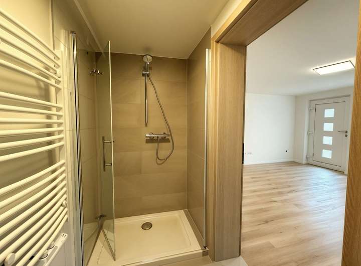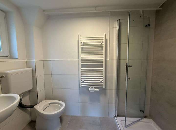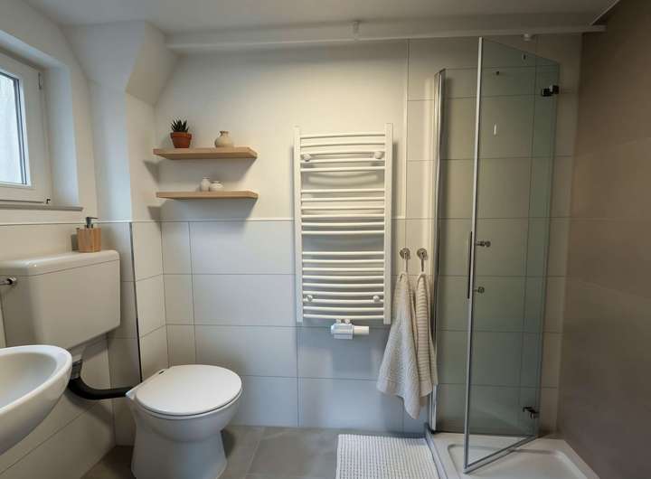 Badezimmer: Genießen Sie ein modernes Bad mit Tageslicht, ausgestattet mit Dusche, Waschtisch und Alibert. Das Badezimmer wurde 2025 wie das gesamte Apartment komplett saniert, sodass Sie sich auf eine frische und angenehme Atmosphäre freuen können.