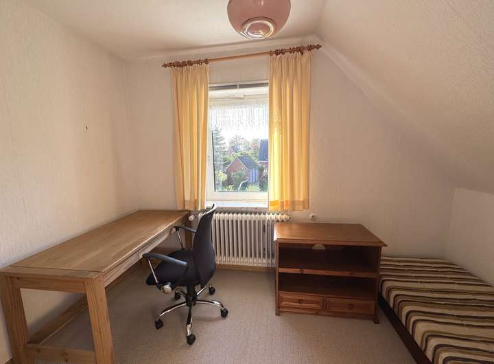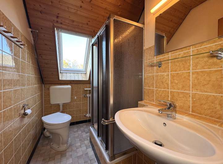 Im Erdgeschoss befinden sich ein Wohn- und Essbereich, ein Schlafzimmer, die Küche sowie ein Badezimmer mit Wanne.