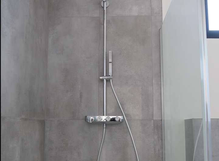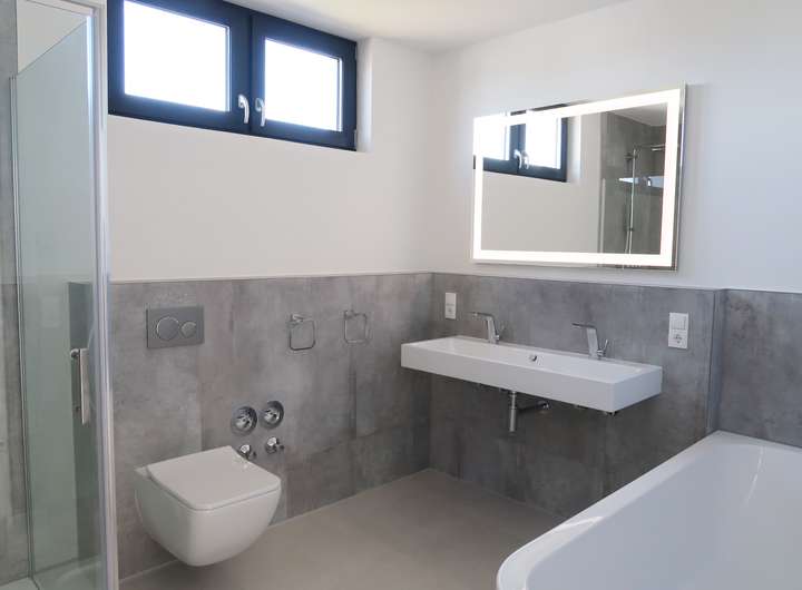 Diese Wohnung besitzt auf der unteren Etage (OG) ein Gäste-WC für Ihre Gäste oder für sich selbst. Auf der oberen Etage (DG) steht den Bewohnern das große Master-Badezimmer in der Nähe des Schlafzimmers und des Ankleidezimmers zur Verfügung. Im Master-Badezimmer fällt der erste Blick natürlich auf den 120cm breiten Doppel-Waschtisch von Kaldewei im modernen puristischen Design von Designerin Anke Salomon. Der Waschtisch besteht aus "Stahl-Emaille" eine widerstandsfähig, langlebig und nachhaltig Verbindung aus Stahl und edlem Glas. Kombiniert wird der Waschtisch in ansprechender Form mit den zwei Premium-Wasserhähnen von Steinberg die nicht umsonst mit dem Award für "High Quality, Design und Bedienkomfort" ausgezeichnet wurden. Das Marken-WC von Villeroy & Boch wird hier kombiniert mit einer hochwertigen Edelstahl-Betätigungsplatte von Geberit. Die optisch herausstechende freistehende Badewanne bietet mit einer bequemen Liegefläche von 160cm genug Gründe für das ein oder andere entspannende Wasserbad. Die großzügige begehbare Dusche ist ausgestattet mit einer Regendusche von Grohe. Diese Regendusche besitzt neben der Regenfunktion "Pure Rain" auch eine weitere Wellness-Strahlart "ActiveRain" für eine stimulierende Massageerfahrung an Kopf, Nacken und Rücken.