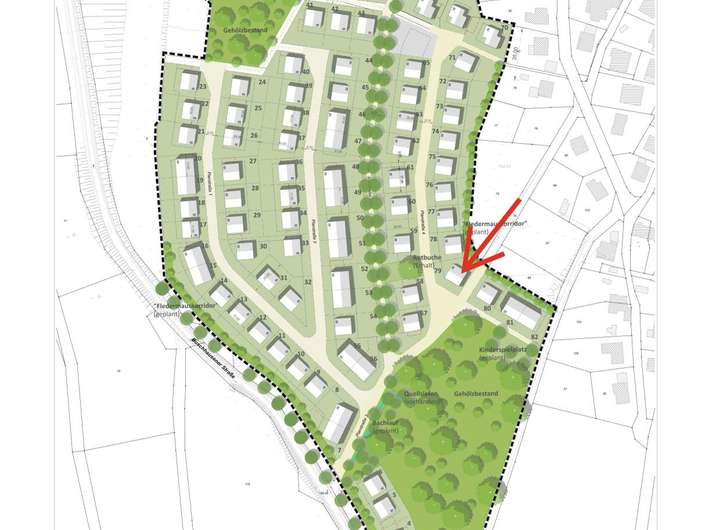 Das hier zum Verkauf angebotene Grundstück mit der Parzellennummer 79 umfasst 517 m² und liegt im westlichen Bereich des Neubaugebietes.
