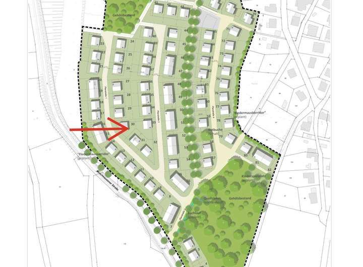 Das hier zum Verkauf angebotene Grundstück mit der Parzellennummer 30 umfasst 600 m² und liegt im westlichen Bereich des Neubaugebietes.