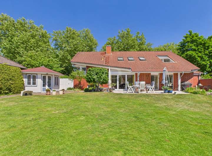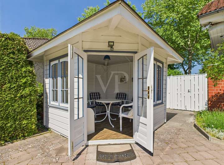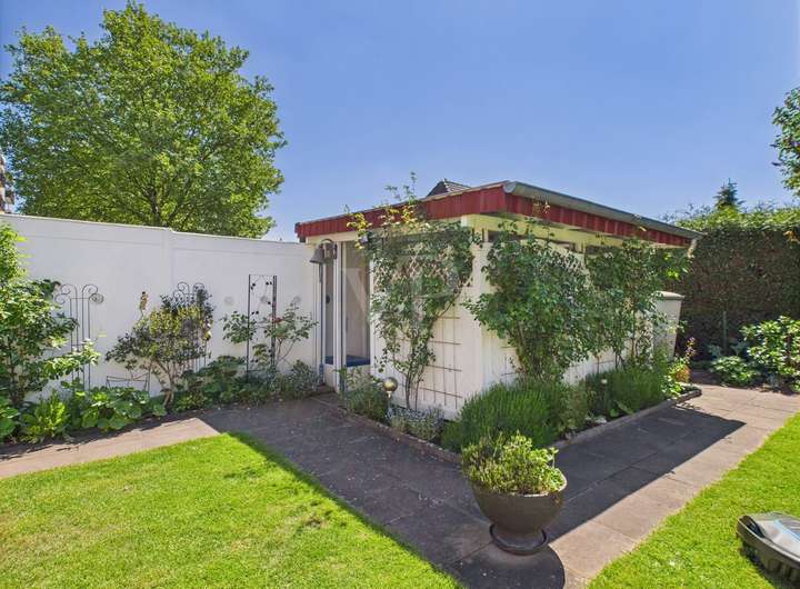 In dem wunderschön angelegten, rundum eingefriedeten Garten mit Teich und Pavillon lässt es sich herrlich entspannen. Ein solide gebauter Unterstand bietet die Möglichkeit zum Aufstellen eines Whirlpools.