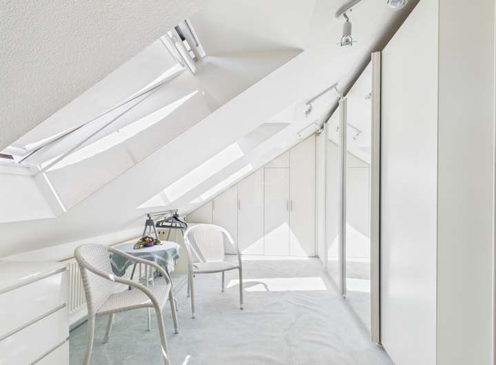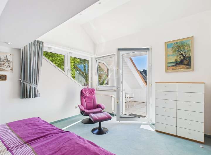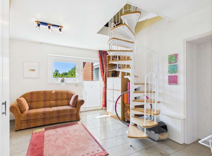 Weitere Stufen führen von hier zu dem wohnlich ausgebauten Dachboden und einem kleinen Abstellraum.