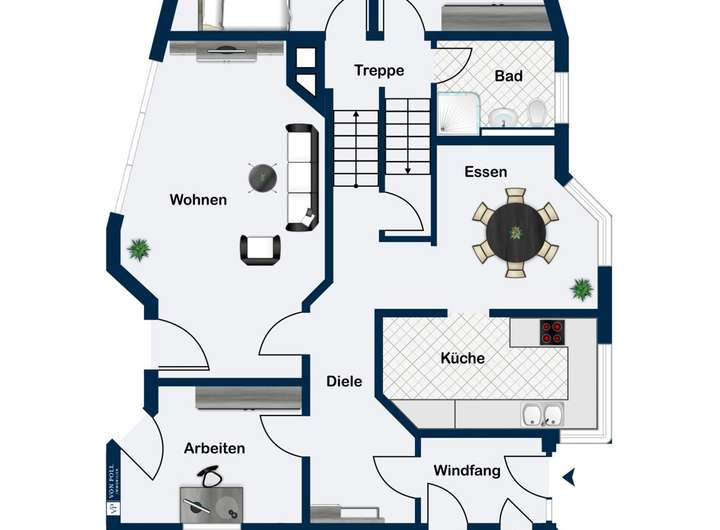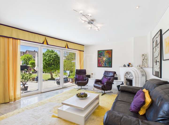 Weiter geht es in die Diele, von der das Arbeitszimmer, der Wohnbereich sowie das Esszimmer mit Zugang zur Küche abzweigen. Der Wohnbereich ist mit einem Kaminanschluss versehen. Der Zugang zu der Terrasse ist sowohl vom Wohnbereich als auch vom Arbeitszimmer möglich.