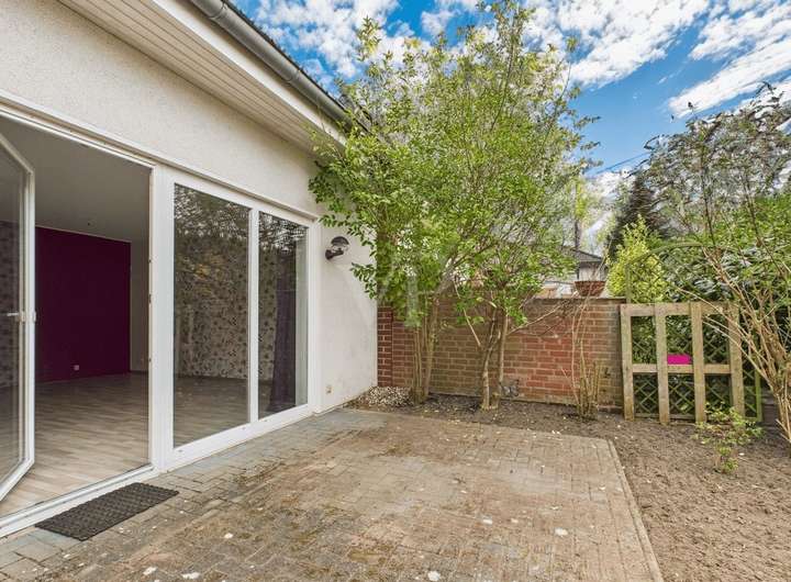 Im Erdgeschoss befinden sich eine Küche, ein Gäste-WC und das mit großen, bodentiefen Fenstern versehene Wohnzimmer mit Ausgang zur Terrasse.