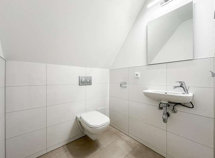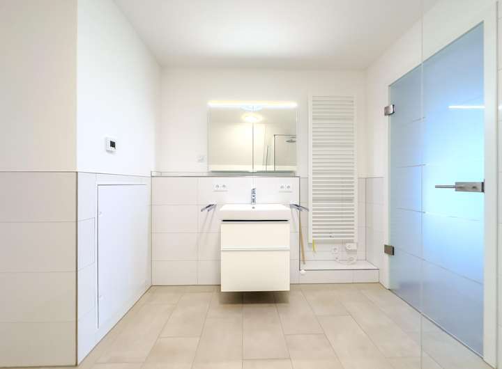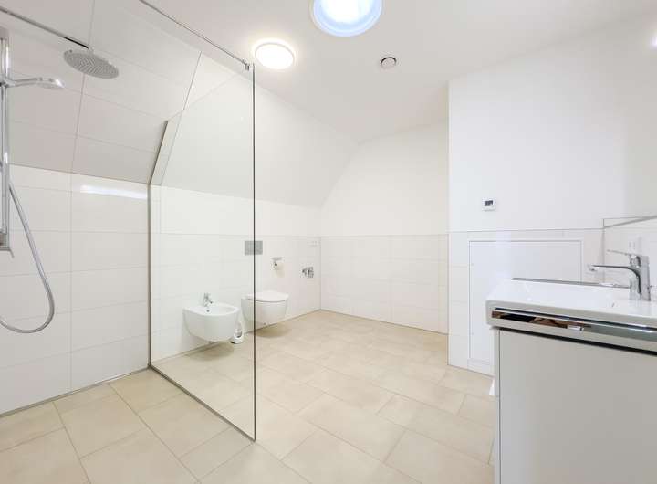 Das großzügige Badezimmer ist mit einer ebenerdigen Dusche, WC, Bidet und Waschmaschinenanschluss ausgestattet - angrenzend befindet sich außerdem ein zusätzliches Gäste-WC.