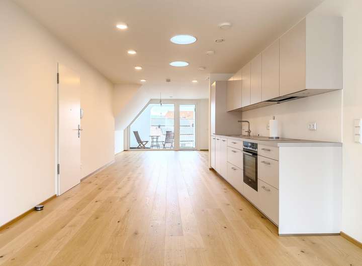 Bereits beim Betreten der Wohnung empfängt Sie ein weitläufiger Wohn-Essbereich, der durch seine offene Gestaltung ein Gefühl von Großzügigkeit und Behaglichkeit vermittelt. Die elegante Einbauküche fügt sich harmonisch in das Raumkonzept ein - vollwertig ausgestattet lässt diese keine Wünsche offen.
