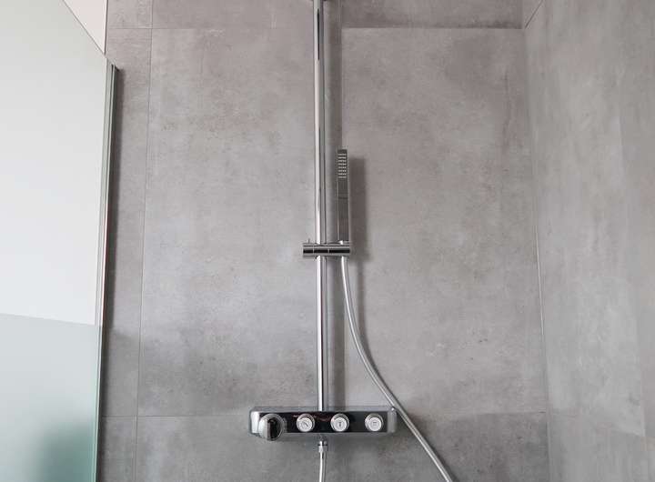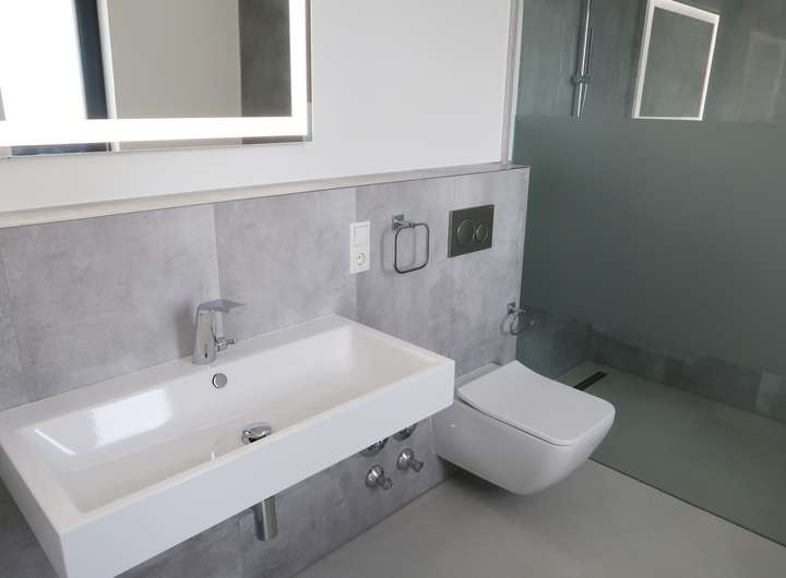 Im Badezimmer steht Ihnen ein großer Waschtisch von Kaldewei im modernen puristischen Design von Designerin Anke Salomon zur Verfügung. Der Waschtisch besteht aus "Stahl-Emaille" eine widerstandsfähig, langlebig und nachhaltig Verbindung aus Stahl und edlem Glas. Kombiniert wird der Waschtisch in ansprechender Form mit einem Premium-Wasserhahn von Steinberg der nicht umsonst mit dem Award für "High Quality, Design und Bedienkomfort" ausgezeichnet wurde. Das Marken-WC von Villeroy & Boch wird hier kombiniert mit einer hochwertigen Edelstahl-Betätigungsplatte von Geberit. Die großzügige begehbare Dusche ist ausgestattet mit einer Regendusche von Grohe. Diese Regendusche besitzt neben der Regenfunktion "Pure Rain" auch eine weitere Wellness-Strahlart "ActiveRain" für eine stimulierende Massageerfahrung an Kopf, Nacken und Rücken.