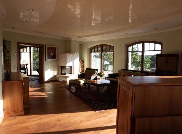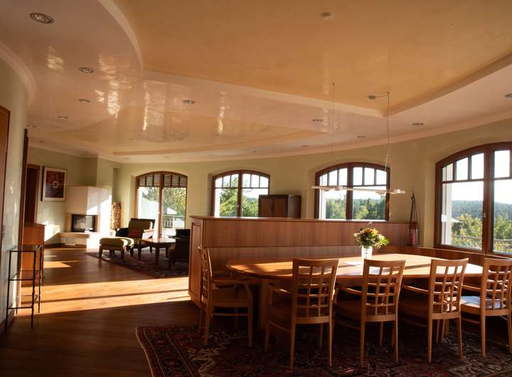 Der repräsentative Wohn- und Essbereich überzeugt durch seine offene, lichtdurchflutete Architektur und schafft ein harmonisches Zusammenspiel von Großzügigkeit und Eleganz. Der Wintergarten mit vollständig verschiebbaren Glasfronten sowie mehrere Sonnenterrassen ermöglichen einen fließenden Übergang zwischen Innen- und Außenbereich und laden zum Verweilen ein.
