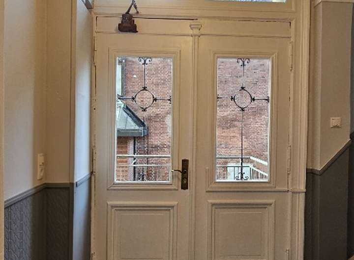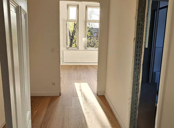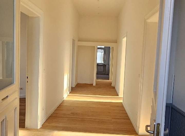 Über das frisch sanierte Treppenhaus gelangt man durch eine große Wohnungseingangstür - verglast mit mattiertem, blickdichten VSG-Sicherheitsglas - in den durchgängigen Hauptflur der Wohnungen.