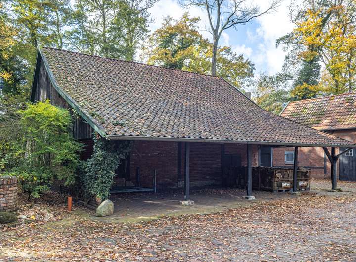 - vier Stellplätze unter Schleppdach der Scheune, Klinkerfassade der Scheune (rot), verkleidet mit Holz, Dach als Satteldach, eingedeckt mit Dachpfannen (rot)