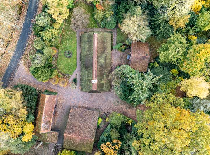 - gepflegter, eingegrünter Gartenbereich versehen mit Rasenflächen, Beete, Sträuchern und Bäumen; Grundstück mit Hecken und Bäumen umzäunt; Grundstück insgesamt über drei Auffahrten erreichbar