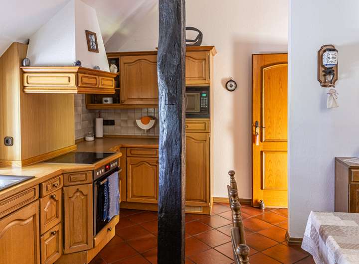 - Küche mit einfacher Einbauküche; Fronten aus Holz (hellbraun); diverse Unterschränke vorhanden, Fliesenspiegel (grau); Fußboden gefliest (rot-braun geflammt),(Bj.: 1990), Fensterausschnitt (Holzverkleidet) von Küche in Flur für mehr Lichteinfall