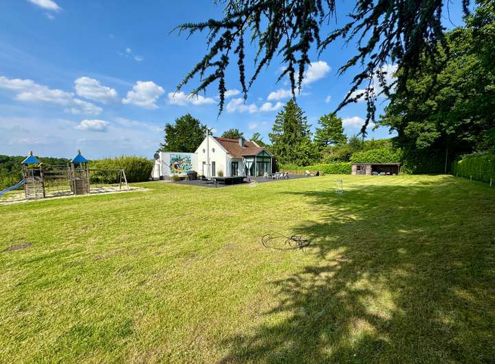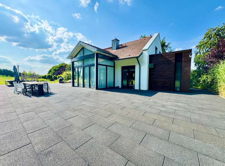Der weitläufige Garten mit Südausrichtung ist eine wahre Oase. Auf zwei Ebenen finden Sie exklusive Rückzugsorte: Eine große Hauptterrasse mit Whirlpool-Bereich (Jacuzzi) und eine zweite Holzterrasse mit herrlichem Blick in den Wald und auf eine Pferdeweide. Hinzu kommen ein moderner Grillplatz, ein eingezäunter Spielbereich für Kinder sowie ein automatisches Bewässerungssystem, das die Pflege des parkähnlichen Grundstücks erleichtert.