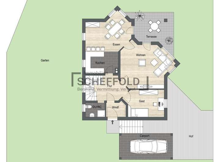 Der an das Einfamilienhaus angrenzende Carport bietet zusätzlich Platz für Ihr Auto und Ihre Fahrräder und rundet dieses attraktive Immobilienangebot ideal ab.